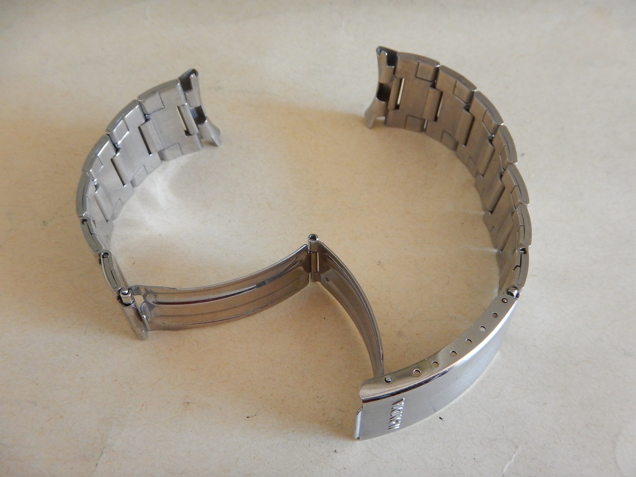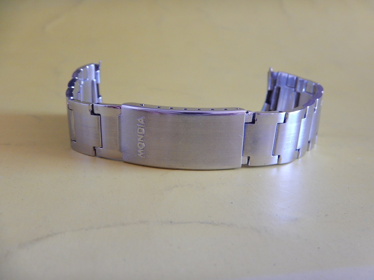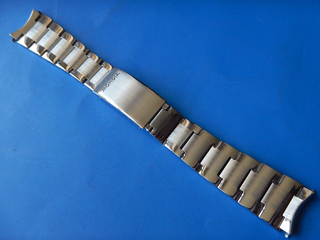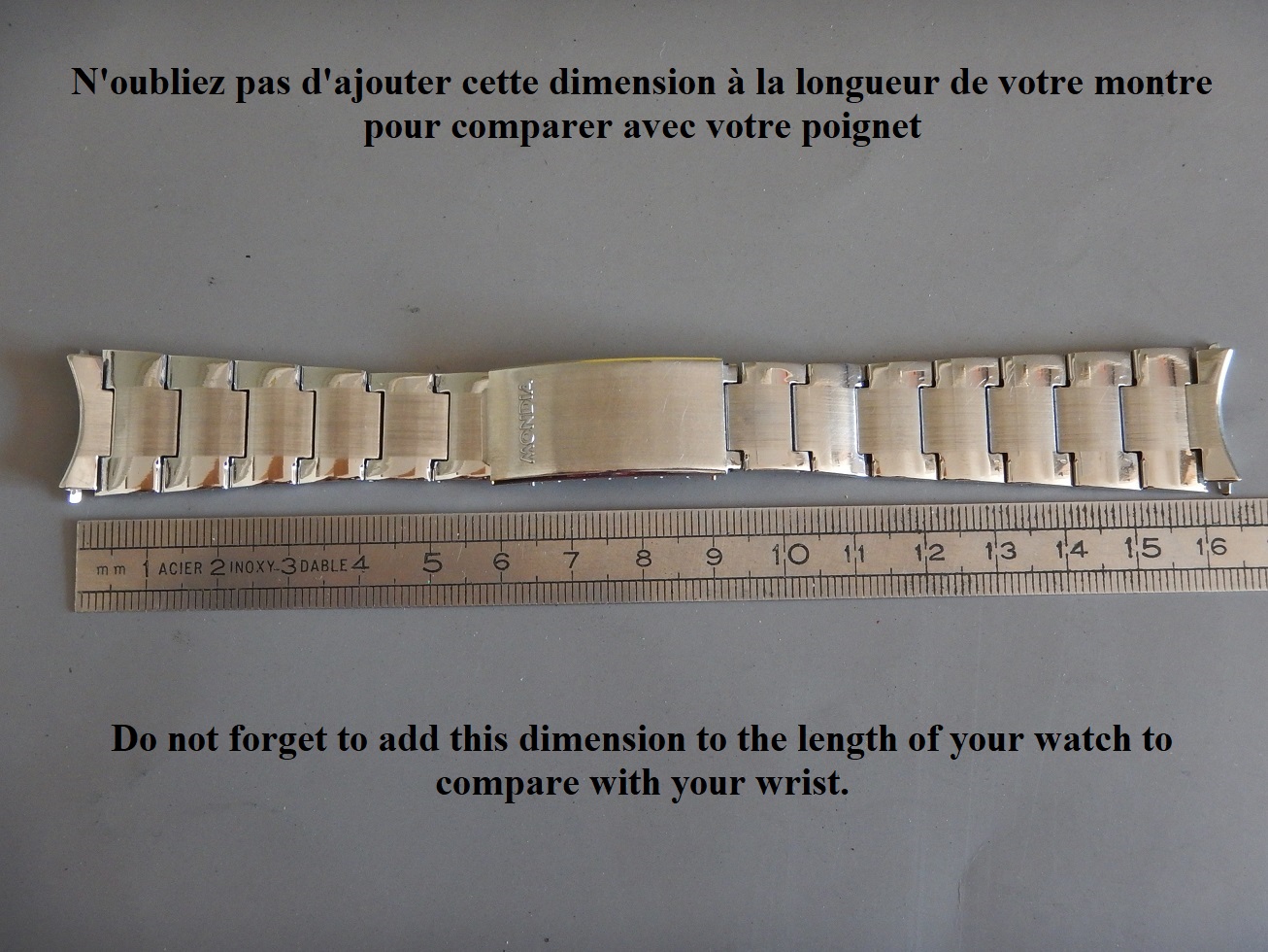 19 MM BRACELET MONDIA ACIER BROSSÉ & BRILLANT ANNÉES 60/70 END LINK COURBES 95.00 € Catégorie : Bracelets métal Contactez-nous Contactez-nous pour acheter 19 MM BRACELET MONDIA ACIER BROSSÉ & BRILLANT ANNÉES 60/70 END LINK COURBES Votre nom Votre e-mail Votre numéro de téléphone Votre message (facultatif) Description Bracelet Mondia, en acier inoxydable sur boucle dépliante, dans un état neuf, des années 60/70. Sa dimension au niveau des entre cornes est de 19 mm et 15.5 mm coté boucle. Sa longueur totale fermé est de 16 cm mais n’oubliez pas de compter la longueur de votre montre pour l’imaginer à votre poignet ou de le comparer avec votre ancien bracelet fermé. Bien entendu il y a la possibilité de l’ajuster à votre poignet en retirant des maillons ou, avec la plus grande précision, grâce aux 4 positions des trous dans la boucle. Produits similaires Bracelets métal24 25 26 27 28 mm SOLIDE BRACELET ROWI ACIER SUR BOUCLE DÉPLOYANTE IDEAL YEMA 55.00 € Lire la suite Bracelets métal19 MM BRACELET H POUR YEMA FLYGRAF RALLYGRAF SUPERMAN ACIER ÉTAT NEUF 70 150.00 € Lire la suite Bracelets19 mm BRACELET YEMA NAVYGRAF ACIER BOUCLE DÉPLOYANTE N.O.S. 70 / 80 110.00 € Lire la suite Bracelets métal18 19 OU 20 MM BRACELET DE MONTRE DorGay ACIER SWISS MADE N.O.S 60 165.00 € Lire la suite