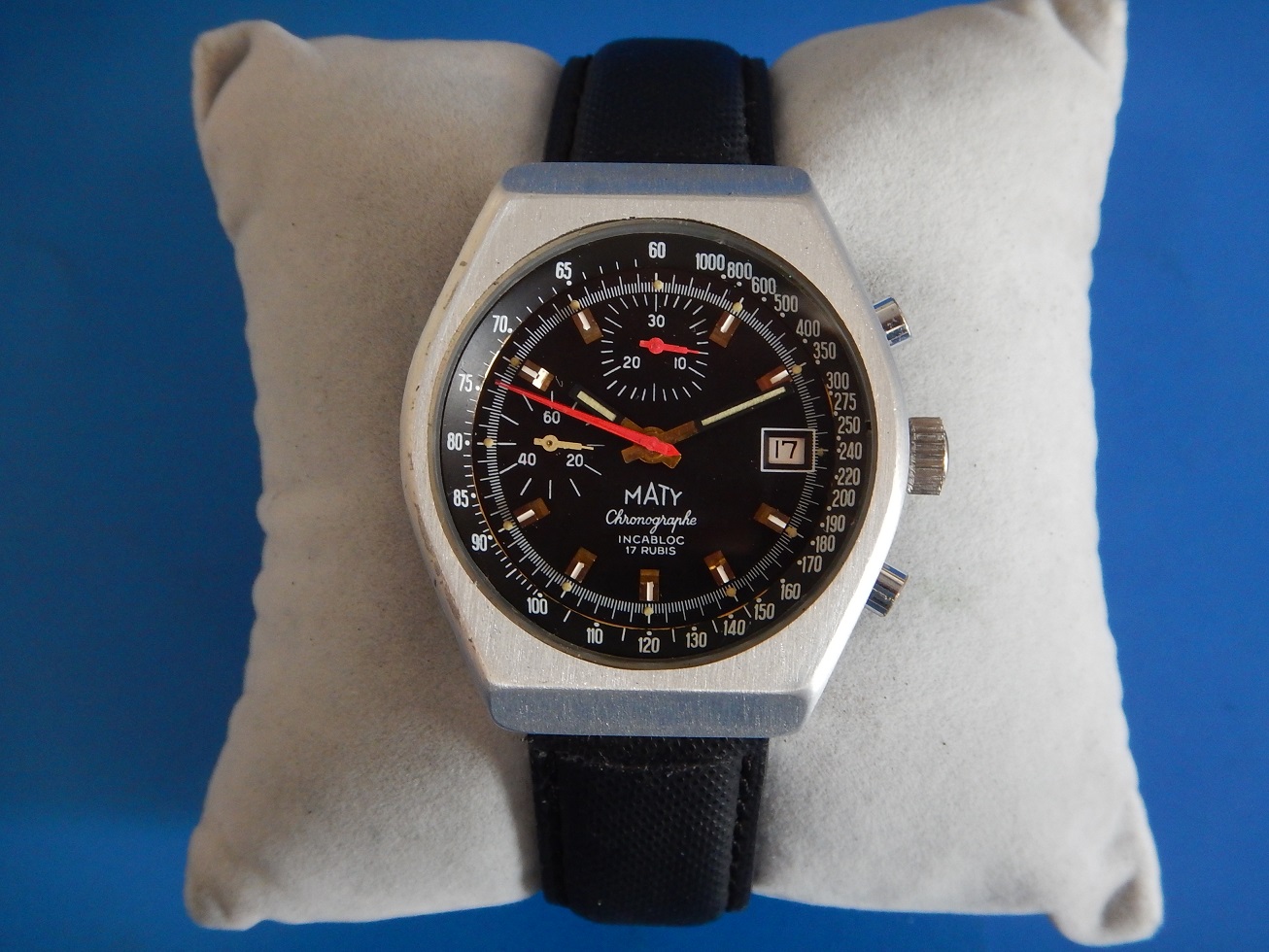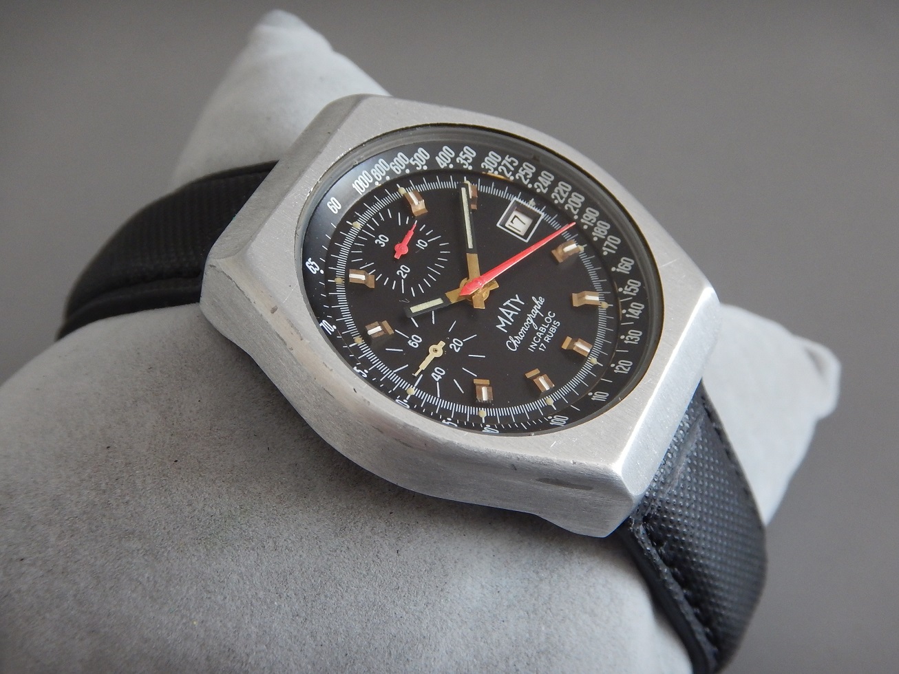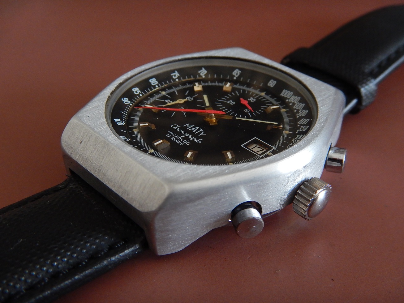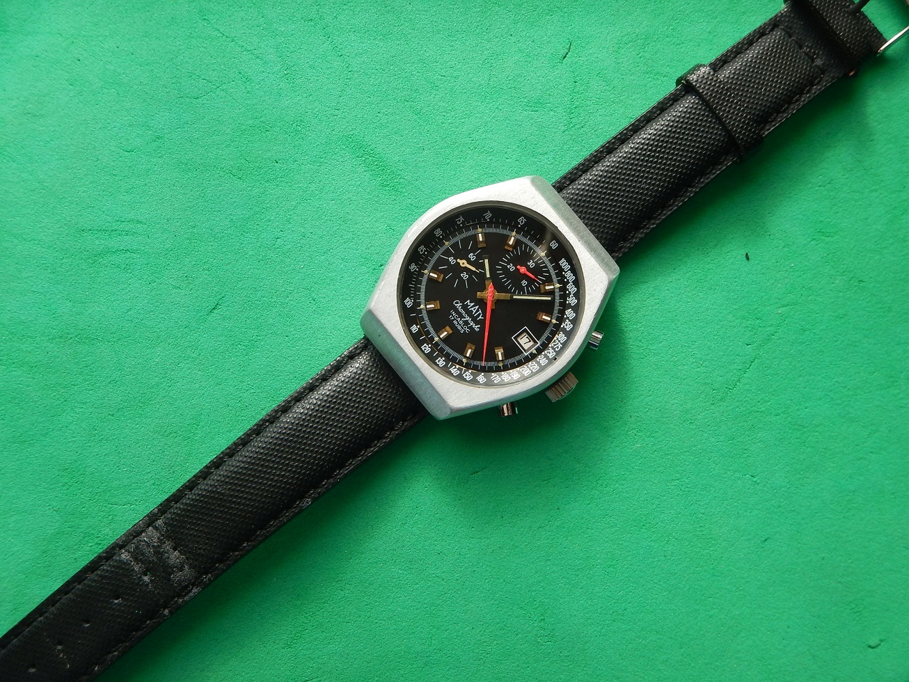 ANNÉES 80 MASSIF CHRONO MATY VALJOUX 7765 SUPERBE ÉTAT SERVICE OK GARANTIE 2 ANS 885.00 € Catégorie : Montres de collection Contactez-nous Contactez-nous pour acheter ANNÉES 80 MASSIF CHRONO MATY VALJOUX 7765 SUPERBE ÉTAT SERVICE OK GARANTIE 2 ANS Votre nom Votre e-mail Votre numéro de téléphone Votre message (facultatif) Description MATY DEPUIS 1952 C’est en 1951 que MATY a pris son envol. Peu de chapraisiens le savent, mais l’entreprise est née aux Chaprais un quartier de Besançon, dans la maison familiale située 7 rue Jeanneney. Natif de la ville de Besançon, à l’époque capitale de l’horlogerie française, c’est naturellement vers ce savoir-faire bisontin que Gérard Mantion s’est d’abord tourné, à l’âge de 24 ans. Manquant de moyen pour ouvrir une boutique, Gérard Mantion et son épouse Elyane se lancent dans la vente par correspondance en éditant un premier catalogue. Une idée audacieuse pour l’époque ! C’était alors inédit en France ! Certains précisent que c’est au premier étage qu’il installe sa société. D’autres que c’est dans un garage au fond de la propriété, la maison existe toujours. Le premier catalogue contient 12 pages présentant 67 modèles de montres pour hommes et femmes. Dès l’année 1952, il baptise sa société du nom de Maty. Il assure sa publicité par des petites annonces qui paraissent dans Le Chasseur Français.. Par la suite, Maty propose de la joaillerie en plus de l’horlogerie. En 1960, la société s’installe au 25 de l’avenue Fontaine-Argent, dans un petit immeuble encore existant. La bijouterie est ajoutée à la vente des montres et la société les fabriquera directement à partir de 1975. En 1968, Maty quitte ses locaux de l’avenue Fontaine-Argent pour ceux, actuels, du boulevard Kennedy. 25 ans plus tard, en 1993, Maty ouvre sa bijouterie emblématique située place de l’Opéra à Paris. Aujourd’hui l’entreprise compte une quarantaine de bijouteries en France, en propre et en affiliation. LES MONTRES MILITAIRES, DE SPORT OU DE NAVIGATION : C’est sans doute la navigation maritime et la résolution du problème de la longitude qui auront été le moteur le plus puissant du progrès de l’horlogerie de précision. Une longue histoire lie les marins aux montres depuis la découverte, par John Harrison en 1735, du calcul de la longitude par le moyen des chronomètres de précision. Sans la montre, impossible de se situer en mer, elle est devenue l’outil indispensable aux expéditions de découvertes. Plus tard, le chemin de fer, avec ses horaires précis étendus à l’échelle des continents et ses convois qui s’entremêlent et se croisent, en a fait l’attribut obligatoire du mécanicien, de l’ingénieur et du voyageur. A cet égard, la guerre de 1914-1918 a le mérite de démontrer où se situe exactement les besoins, on a vu s’entamer une modification des comportements avec une généralisation des montres bracelets. La navigation, la guerre, l’automobile, l’aviation, les jeux Olympiques enfin lui offriront ses lettres de noblesses. Tous ces éléments ont marqué l’histoire horlogère. LE CHRONOGRAPHE La vie moderne dans ses trépidantes manifestations, ne se contente plus de la minute ou de la seconde, elle dissèque l’unité de temps pour pouvoir apprécier les infimes durées dont elle a besoin. Il est important donc de mesurer les durées avec une rigueur plus accentuée, et vous qui portez à votre bras une montre chronographe, savez-vous toute la somme d’ingéniosité qu’a dû déployer une pléiade de chercheurs et d’horlogers pour adapter à un mouvement, ces mécanismes subtils prêts à obéir à vos réactions dans la fraction de seconde ??? Dociles, les aiguilles se mettent en marche, elles compteront pour vous les minutes et les heures et s’arrêteront à l’instant choisi : leurs positions mêmes définiront la durée que vous avez voulu évaluer. NE PAS CONFONDRE CHRONOGRAPHE ET CHRONOMÈTRE : Le chronographe est un appareil horaire, dans le cas particulier une montre, possédant une aiguille placée au centre du mouvement. Cette aiguille, nommée « trotteuse », peut être à volonté : mise en marche, arrêtée, puis ramenée au point de départ. Ces différentes « fonctions » sont opérées au moyen d’un mécanisme dit « de chronographe ». On confond assez souvent les termes de chronographe et de chronomètre (cependant un chronographe peut être aussi chronomètre, vous comprendrez …). Un chronomètre est une montre qui, observée dans différentes positions et à des températures diverses, donne des résultats de réglage suffisants pour obtenir un certificat officiel de marche (certificat de chronométrie en général délivré par le COSC : Contrôle Officiel Suisse des Chronomètres). Moralité, faites moi confiance… Ce chrono est un chronographe. DESCRIPTION ET CARACTÉRISTIQUES TECHNIQUES Période de fabrication : années 80. Dimensions : modèle de grande taille pour cette époque, conçu pour être efficace dans toutes les circonstances, largeur 40,50 mm hors remontoir, longueur totale 46 mm à l’extrémité des anses, et 13,85 mm d’épaisseur verre compris, modèle pour homme. Boîtier : en superbe état, en aluminium, brossé, avec le fond vissé en acier inoxydable. Une silhouette sportive et intemporelle, de forme tonneau. Cadran : il est noir couplé, notre chrono possède deux compteurs, des aiguilles heures et minutes noires de type « bâtons » avec une partie « squelette » luminescente. La trotteuse centrale du chrono est de couleur rouge comme celle du compteur des minutes à midi sur 30. Le compteur de gauche avec une aiguille blanche est celui de la trotteuse permanente sur 60 secondes. Observez la beauté et la précision des « chemins de fer » de l’échelle tachymétrique. Verre : minéral (en verre), plat, neuf, je l’ai remplacé lors de ma révision complète. Mouvement : mécani