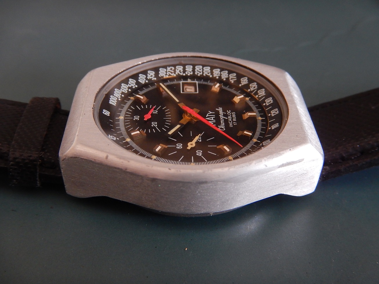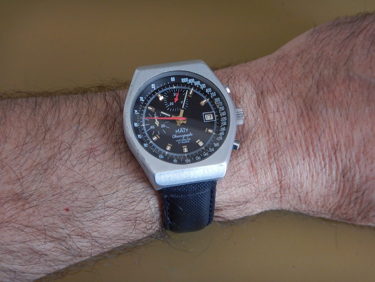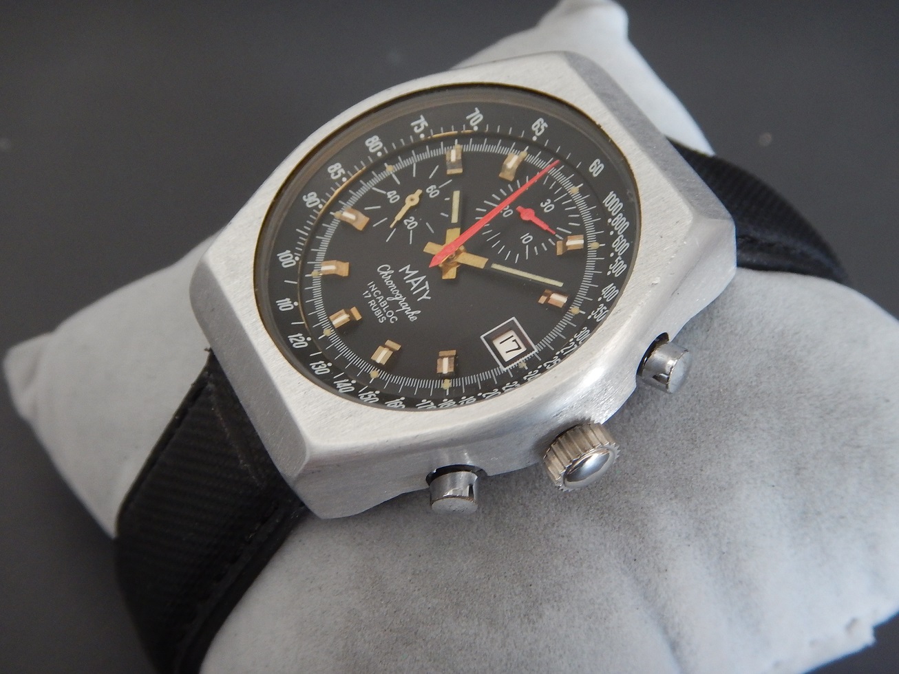 ANNÉES 80 MASSIF CHRONO MATY VALJOUX 7765 SUPERBE ÉTAT SERVICE OK GARANTIE 2 ANS 885.00 € Catégorie : Montres de collection Contactez-nous Contactez-nous pour acheter ANNÉES 80 MASSIF CHRONO MATY VALJOUX 7765 SUPERBE ÉTAT SERVICE OK GARANTIE 2 ANS Votre nom Votre e-mail Votre numéro de téléphone Votre message (facultatif) Description MATY DEPUIS 1952 C’est en 1951 que MATY a pris son envol. Peu de chapraisiens le savent, mais l’entreprise est née aux Chaprais un quartier de Besançon, dans la maison familiale située 7 rue Jeanneney. Natif de la ville de Besançon, à l’époque capitale de l’horlogerie française, c’est naturellement vers ce savoir-faire bisontin que Gérard Mantion s’est d’abord tourné, à l’âge de 24 ans. Manquant de moyen pour ouvrir une boutique, Gérard Mantion et son épouse Elyane se lancent dans la vente par correspondance en éditant un premier catalogue. Une idée audacieuse pour l’époque ! C’était alors inédit en France ! Certains précisent que c’est au premier étage qu’il installe sa société. D’autres que c’est dans un garage au fond de la propriété, la maison existe toujours. Le premier catalogue contient 12 pages présentant 67 modèles de montres pour hommes et femmes. Dès l’année 1952, il baptise sa société du nom de Maty. Il assure sa publicité par des petites annonces qui paraissent dans Le Chasseur Français.. Par la suite, Maty propose de la joaillerie en plus de l’horlogerie. En 1960, la société s’installe au 25 de l’avenue Fontaine-Argent, dans un petit immeuble encore existant. La bijouterie est ajoutée à la vente des montres et la société les fabriquera directement à partir de 1975. En 1968, Maty quitte ses locaux de l’avenue Fontaine-Argent pour ceux, actuels, du boulevard Kennedy. 25 ans plus tard, en 1993, Maty ouvre sa bijouterie emblématique située place de l’Opéra à Paris. Aujourd’hui l’entreprise compte une quarantaine de bijouteries en France, en propre et en affiliation. LES MONTRES MILITAIRES, DE SPORT OU DE NAVIGATION : C’est sans doute la navigation maritime et la résolution du problème de la longitude qui auront été le moteur le plus puissant du progrès de l’horlogerie de précision. Une longue histoire lie les marins aux montres depuis la découverte, par John Harrison en 1735, du calcul de la longitude par le moyen des chronomètres de précision. Sans la montre, impossible de se situer en mer, elle est devenue l’outil indispensable aux expéditions de découvertes. Plus tard, le chemin de fer, avec ses horaires précis étendus à l’échelle des continents et ses convois qui s’entremêlent et se croisent, en a fait l’attribut obligatoire du mécanicien, de l’ingénieur et du voyageur. A cet égard, la guerre de 1914-1918 a le mérite de démontrer où se situe exactement les besoins, on a vu s’entamer une modification des comportements avec une généralisation des montres bracelets. La navigation, la guerre, l’automobile, l’aviation, les jeux Olympiques enfin lui offriront ses lettres de noblesses. Tous ces éléments ont marqué l’histoire horlogère. LE CHRONOGRAPHE La vie moderne dans ses trépidantes manifestations, ne se contente plus de la minute ou de la seconde, elle dissèque l’unité de temps pour pouvoir apprécier les infimes durées dont elle a besoin. Il est important donc de mesurer les durées avec une rigueur plus accentuée, et vous qui portez à votre bras une montre chronographe, savez-vous toute la somme d’ingéniosité qu’a dû déployer une pléiade de chercheurs et d’horlogers pour adapter à un mouvement, ces mécanismes subtils prêts à obéir à vos réactions dans la fraction de seconde ??? Dociles, les aiguilles se mettent en marche, elles compteront pour vous les minutes et les heures et s’arrêteront à l’instant choisi : leurs positions mêmes définiront la durée que vous avez voulu évaluer. NE PAS CONFONDRE CHRONOGRAPHE ET CHRONOMÈTRE : Le chronographe est un appareil horaire, dans le cas particulier une montre, possédant une aiguille placée au centre du mouvement. Cette aiguille, nommée « trotteuse », peut être à volonté : mise en marche, arrêtée, puis ramenée au point de départ. Ces différentes « fonctions » sont opérées au moyen d’un mécanisme dit « de chronographe ». On confond assez souvent les termes de chronographe et de chronomètre (cependant un chronographe peut être aussi chronomètre, vous comprendrez …). Un chronomètre est une montre qui, observée dans différentes positions et à des températures diverses, donne des résultats de réglage suffisants pour obtenir un certificat officiel de marche (certificat de chronométrie en général délivré par le COSC : Contrôle Officiel Suisse des Chronomètres). Moralité, faites moi confiance… Ce chrono est un chronographe. DESCRIPTION ET CARACTÉRISTIQUES TECHNIQUES Période de fabrication : années 80. Dimensions : modèle de grande taille pour cette époque, conçu pour être efficace dans toutes les circonstances, largeur 40,50 mm hors remontoir, longueur totale 46 mm à l’extrémité des anses, et 13,85 mm d’épaisseur verre compris, modèle pour homme. Boîtier : en superbe état, en aluminium, brossé, avec le fond vissé en acier inoxydable. Une silhouette sportive et intemporelle, de forme tonneau. Cadran : il est noir couplé, notre chrono possède deux compteurs, des aiguilles heures et minutes noires de type « bâtons » avec une partie « squelette » luminescente. La trotteuse centrale du chrono est de couleur rouge comme celle du compteur des minutes à midi sur 30. Le compteur de gauche avec une aiguille blanche est celui de la trotteuse permanente sur 60 secondes. Observez la beauté et la précision des « chemins de fer » de l’échelle tachymétrique. Verre : minéral (en verre), plat, neuf, je l’ai remplacé lors de ma révision complète. Mouvement : mécani