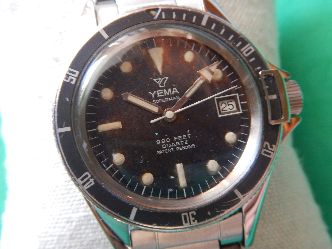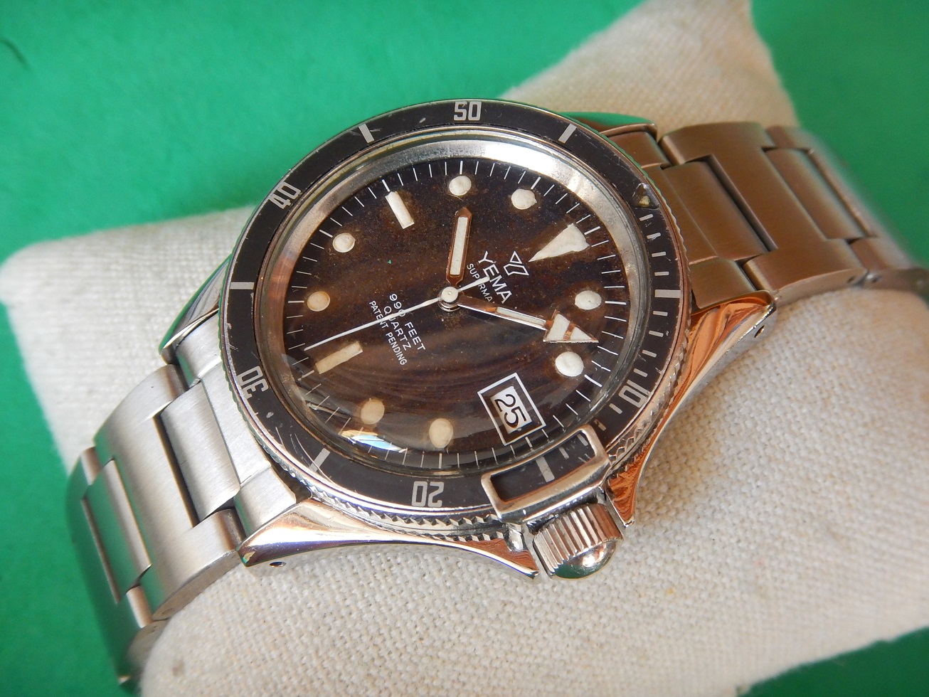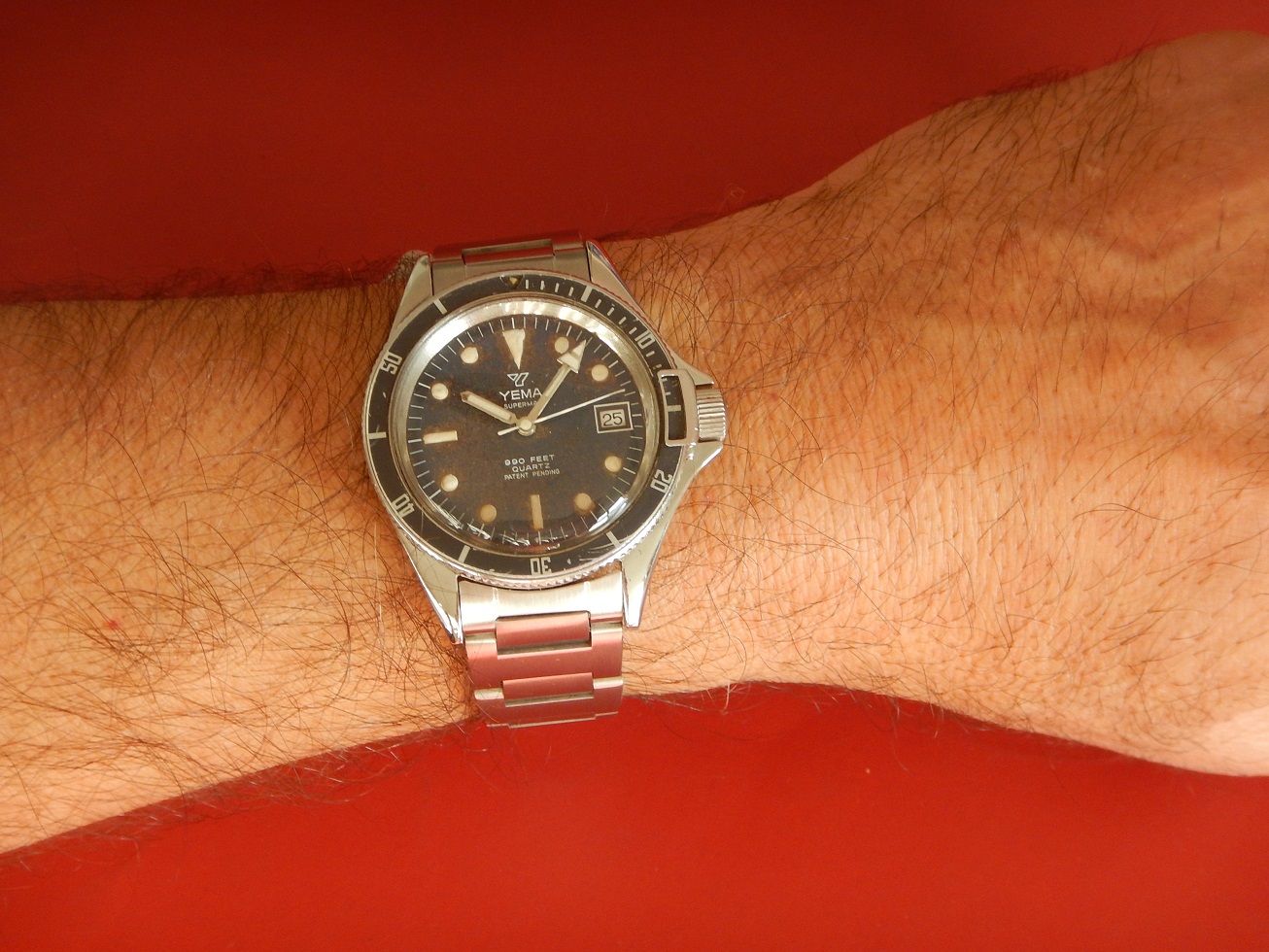 DÉBUT 80 YEMA SUPERMAN 300M DIVER BRACELET H TOUTE ACIER RÉVISÉE GARANTIE 2 ANS 640.00 € Catégorie : Montres de collection Contactez-nous Contactez-nous pour acheter DÉBUT 80 YEMA SUPERMAN 300M DIVER BRACELET H TOUTE ACIER RÉVISÉE GARANTIE 2 ANS Votre nom Votre e-mail Votre numéro de téléphone Votre message (facultatif) Description ET DEPUIS QUAND YEMA ??? Peu de personnes savent que Yema est une marque Française … Et oui, si l’on demande à un étranger quelles sont les marques Françaises qui leurs viennent à l’esprit, ils répondent Lip et Yema. Et pour cause la société Yema commence en 1948, c’est monsieur Belmont qui en a l’idée. Au fil des années cette marque Française se forge une solide réputation sur le marché des chronomètres et des montres de plongées. En 1965, grâce au succès du marché américains, Yema est proclamée la marque Française la plus exportée. En 1982 Yema équipe les spationautes français et devient fournisseur officiel du CNES.En 1982, Yema franchit le seuil historique des 2 millions d’exemplaires produits. La marque connaît ensuite plusieurs rachats successifs : Matra en 1982, CGH en 1988 et Yema SA en 1995. Depuis 1948 Yema cultive son image de multispécialiste et nous confectionne de superbes gardes temps de qualité et collectionnés de nos jours. La vocation de Yema reste sportive, il y a trois univers de référence, cet héritage est simple à décoder : la terre, l’air et la mer. La course automobile : c’est le chronographe de motor racing. Le ciel : c’est le chrono d’aviation. L’univers nautique : c’est la montre de plongée. COMME SON NOM L’INDIQUE : SUPERMAN En 1963, Yema sort la « Superman », une montre étanche à 300 mètres, dédiée aux professionnels de la plongée. Comme son nom l’indique, ce modèle rend hommage aux sportifs de haut niveau comme en témoignent les slogans publicitaires de l’époque : « Yema the time of heroes. Extraordinary watches for extraordinary men », en anglais même sur les publicités françaises. Cette montre a été choisie notamment pour et par de grandes expéditions françaises (Serge Debru, globe-trotter ; Lionel Terray et Robert Paragot, alpinistes de haut niveau). Désormais, la marque appuie sa communication sur le caractère sportif de ses montres. Pour la « Superman » par exemple, Yema est très explicite sur le message, présentant ce modèle comme un véritable instrument technologique, à la fois précis et esthétique : « Pourquoi une montre de professionnel de la plongée au poignet d’un homme d’affaires ? (…) Étanche à 300 m de profondeur, insensible aux chocs, à la poussière, à la chaleur ou au froid, « Superman » n’est pas du tout le genre de montre que l’on a besoin de protéger. Imperturbablement fidèle au plus fort de l’action, votre « Superman » se jouera aussi des petits risques que vous lui ferez courir… tous les jours » DESCRIPTION ET CARACTÉRISTIQUES TECHNIQUES Dimensions : largeur hors remontoir 40 mm, 48,35 mm à l’extrémité des anses et 12,3 mm d’épaisseur verre compris. Verre : parfait état, acrylique, bagué, bombé, d’origine. Boitier : Avec des lignes classiques des plongeuses qui ont fait la renommée de YEMA, un diamètre imposant, des anses massives, et une lunette tournante bi-directionelle avec le « bloque lunette » lorsque la couronne de remontoir est vissée, elle la bloque lors de la plongée grâce à son « frein butée ». Les cornes sont assez longues et plongent avec un léger angle, accentuant son élégance, le tout est coiffé d’un verre bombé plexi en parfait état. Il dispose d’un fond vissé en acier inoxydable, le tout comme vous pouvez le constater sur les photos, en superbe état pour une montre de presque 50 ans. Cadran : mat, légèrement « tropicalisé », avec des index géométriques luminescents (voir la photo dans le noir complet). Observez ses larges aiguilles « broad arrow » et son délicat chemin de fer sur la circonférence pour le détail des minutes ou des secondes suivant l’aiguille qui l’indique. Mouvement : Durant les années 80, Hattori-Seiko et France Ébauche fournissent de façon progressive ses calibres à Matra (YEMA et ses marques). Ici, il s’agit du calibre FE 7220. Installée à Besançon et créé en 1920, cette fabrique d’ébauches résulte de la cession de la société de Victor Jeambrun à son frère Joseph qui nomme la nouvelle entité : Établissement Joseph Jeambrun Fabrique d’Ébauches. Michel Jeambrun succède à son père et en 1967, Yves Jeambrun créé France Ébauches qui possède à cette époque cinq sous-marques : FEMGA : Fabrique d’ébauches de montres du genevois Annemasse Femand Girardet et fils SA à Morteau Ébauches Cupillard SA à VillersleLac Joseph Jeambrun : fabrique d’ébauches à Maiche Technic Ébauches à Maiche Au milieu des années 80, après avoir racheté la participation de SMH avec l’aide d’Indosuez et de la société de développement régional Centrest, France Ébauches redevient un groupe horloger français dirigé et majoritairement détenu par monsieur Perret. FE est le premier fabricant de mouvements de la CEE, le premier fabricant horloger français et le sixième fabricant mondial de mouvements à quartz analogique. 835 salariés étaient répartis dans trois usines en France situées à Valdahon et à Maiche. Pour en revenir à ce FE 7220, c’est un calibre très fiable, comme tous les mouvements utilisés par la marque depuis ses débuts, c’est d’ailleurs la raison pour laquelle Yema est une grande marque… celui-ci est en parfait état, je viens de lui faire une révision complète afin d’en assurer une garantie de 2 ans, il fonctionnera encore longtemps. Très fiable solide et précis, avec stop seconde, dateur et son correcteur rapide sur la première position en tirant le remontoir. Elle sera donc garantie et la pile neuve, sachant que dans la plupart d
