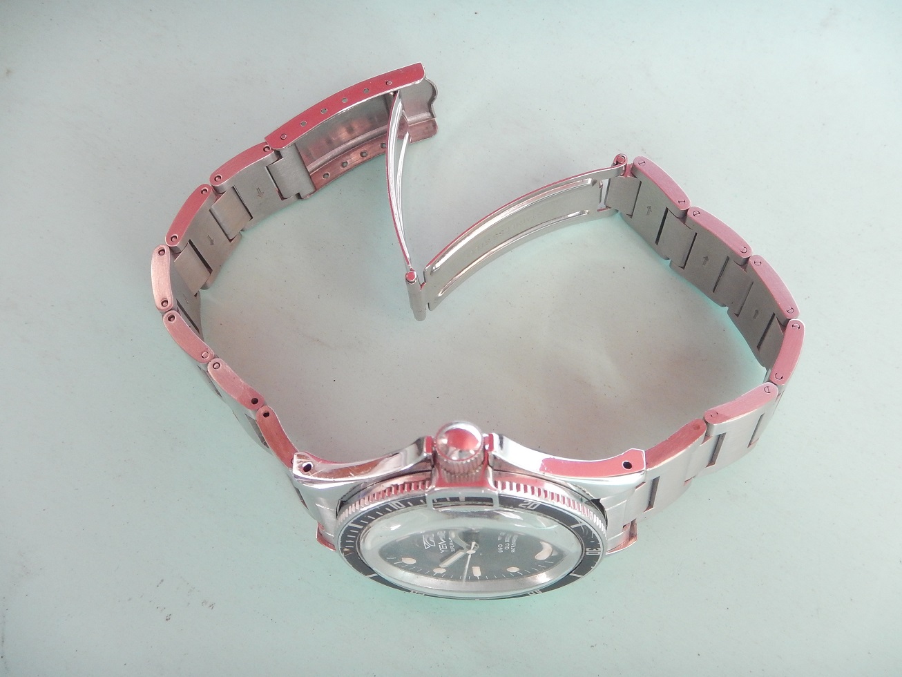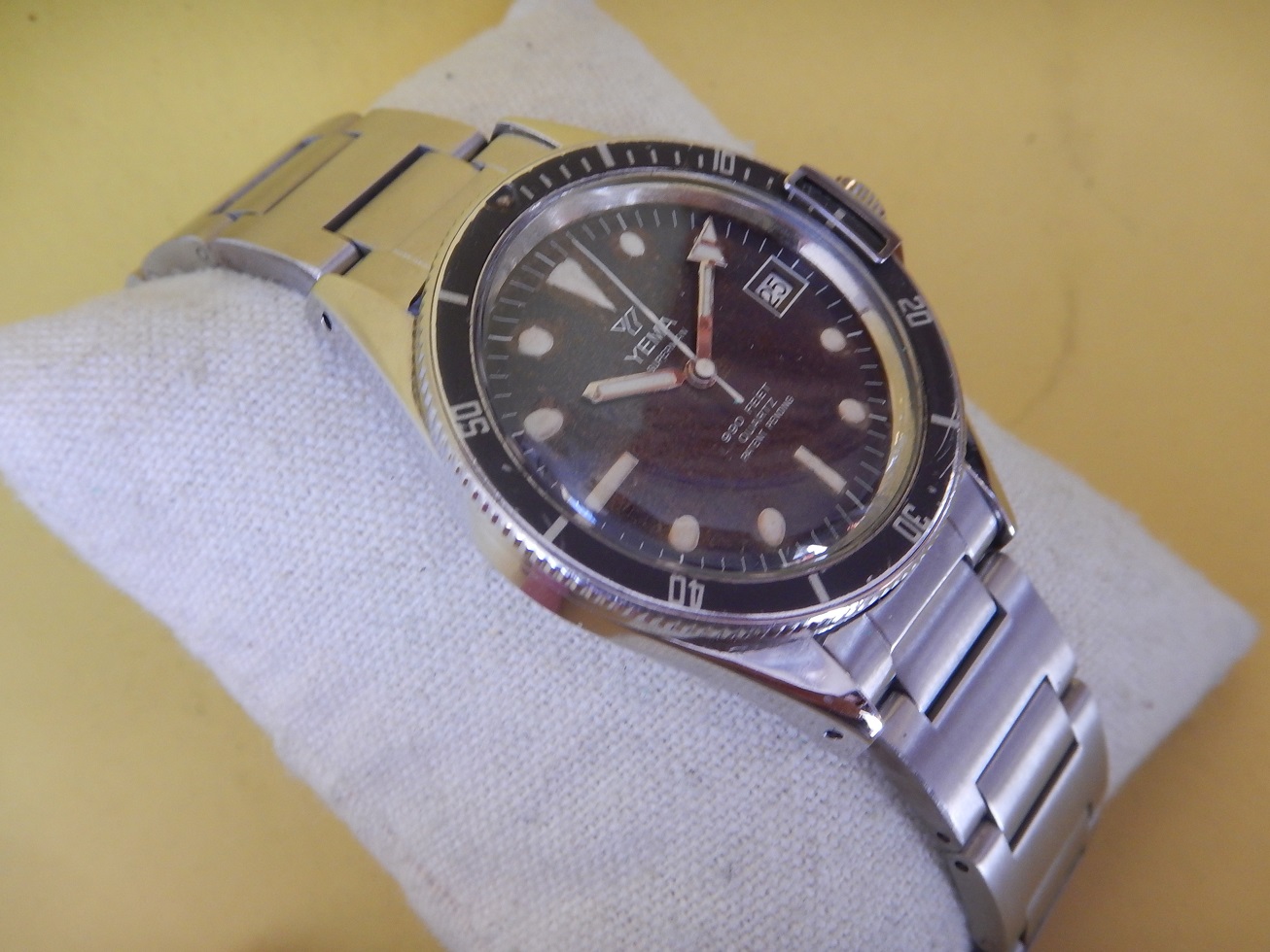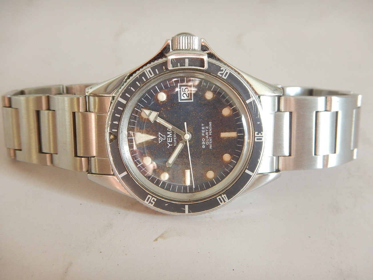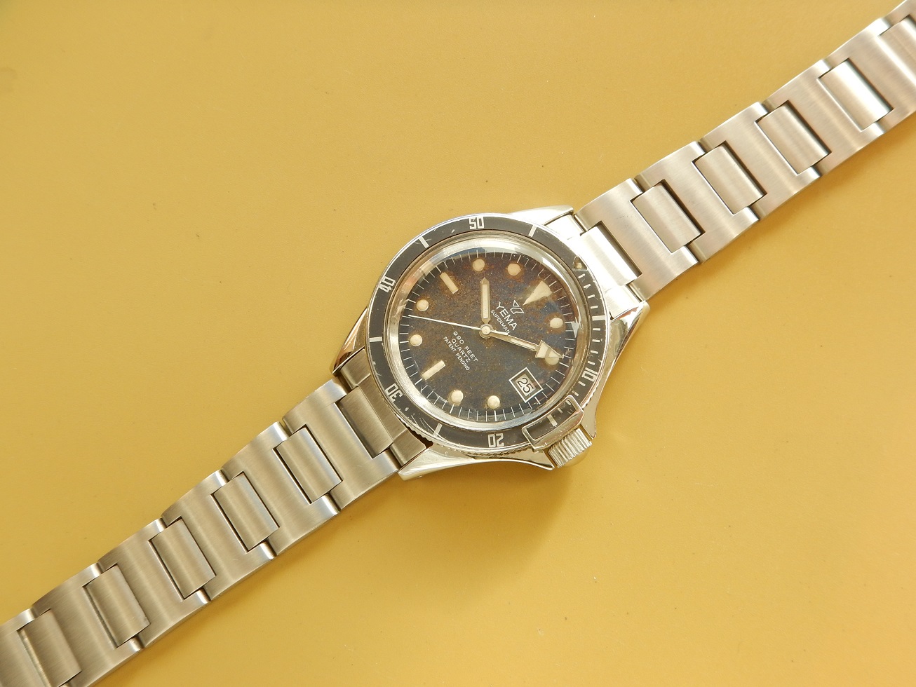DÉBUT 80 YEMA SUPERMAN 300M DIVER BRACELET H TOUTE ACIER RÉVISÉE GARANTIE 2 ANS 640.00 € Catégorie : Montres de collection Contactez-nous Contactez-nous pour acheter DÉBUT 80 YEMA SUPERMAN 300M DIVER BRACELET H TOUTE ACIER RÉVISÉE GARANTIE 2 ANS Votre nom Votre e-mail Votre numéro de téléphone Votre message (facultatif) Description ET DEPUIS QUAND YEMA ??? Peu de personnes savent que Yema est une marque Française … Et oui, si l’on demande à un étranger quelles sont les marques Françaises qui leurs viennent à l’esprit, ils répondent Lip et Yema. Et pour cause la société Yema commence en 1948, c’est monsieur Belmont qui en a l’idée. Au fil des années cette marque Française se forge une solide réputation sur le marché des chronomètres et des montres de plongées. En 1965, grâce au succès du marché américains, Yema est proclamée la marque Française la plus exportée. En 1982 Yema équipe les spationautes français et devient fournisseur officiel du CNES.En 1982, Yema franchit le seuil historique des 2 millions d’exemplaires produits. La marque connaît ensuite plusieurs rachats successifs : Matra en 1982, CGH en 1988 et Yema SA en 1995. Depuis 1948 Yema cultive son image de multispécialiste et nous confectionne de superbes gardes temps de qualité et collectionnés de nos jours. La vocation de Yema reste sportive, il y a trois univers de référence, cet héritage est simple à décoder : la terre, l’air et la mer. La course automobile : c’est le chronographe de motor racing. Le ciel : c’est le chrono d’aviation. L’univers nautique : c’est la montre de plongée. COMME SON NOM L’INDIQUE : SUPERMAN En 1963, Yema sort la « Superman », une montre étanche à 300 mètres, dédiée aux professionnels de la plongée. Comme son nom l’indique, ce modèle rend hommage aux sportifs de haut niveau comme en témoignent les slogans publicitaires de l’époque : « Yema the time of heroes. Extraordinary watches for extraordinary men », en anglais même sur les publicités françaises. Cette montre a été choisie notamment pour et par de grandes expéditions françaises (Serge Debru, globe-trotter ; Lionel Terray et Robert Paragot, alpinistes de haut niveau). Désormais, la marque appuie sa communication sur le caractère sportif de ses montres. Pour la « Superman » par exemple, Yema est très explicite sur le message, présentant ce modèle comme un véritable instrument technologique, à la fois précis et esthétique : « Pourquoi une montre de professionnel de la plongée au poignet d’un homme d’affaires ? (…) Étanche à 300 m de profondeur, insensible aux chocs, à la poussière, à la chaleur ou au froid, « Superman » n’est pas du tout le genre de montre que l’on a besoin de protéger. Imperturbablement fidèle au plus fort de l’action, votre « Superman » se jouera aussi des petits risques que vous lui ferez courir… tous les jours » DESCRIPTION ET CARACTÉRISTIQUES TECHNIQUES Dimensions : largeur hors remontoir 40 mm, 48,35 mm à l’extrémité des anses et 12,3 mm d’épaisseur verre compris. Verre : parfait état, acrylique, bagué, bombé, d’origine. Boitier : Avec des lignes classiques des plongeuses qui ont fait la renommée de YEMA, un diamètre imposant, des anses massives, et une lunette tournante bi-directionelle avec le « bloque lunette » lorsque la couronne de remontoir est vissée, elle la bloque lors de la plongée grâce à son « frein butée ». Les cornes sont assez longues et plongent avec un léger angle, accentuant son élégance, le tout est coiffé d’un verre bombé plexi en parfait état. Il dispose d’un fond vissé en acier inoxydable, le tout comme vous pouvez le constater sur les photos, en superbe état pour une montre de presque 50 ans. Cadran : mat, légèrement « tropicalisé », avec des index géométriques luminescents (voir la photo dans le noir complet). Observez ses larges aiguilles « broad arrow » et son délicat chemin de fer sur la circonférence pour le détail des minutes ou des secondes suivant l’aiguille qui l’indique. Mouvement : Durant les années 80, Hattori-Seiko et France Ébauche fournissent de façon progressive ses calibres à Matra (YEMA et ses marques). Ici, il s’agit du calibre FE 7220. Installée à Besançon et créé en 1920, cette fabrique d’ébauches résulte de la cession de la société de Victor Jeambrun à son frère Joseph qui nomme la nouvelle entité : Établissement Joseph Jeambrun Fabrique d’Ébauches. Michel Jeambrun succède à son père et en 1967, Yves Jeambrun créé France Ébauches qui possède à cette époque cinq sous-marques : FEMGA : Fabrique d’ébauches de montres du genevois Annemasse Femand Girardet et fils SA à Morteau Ébauches Cupillard SA à VillersleLac Joseph Jeambrun : fabrique d’ébauches à Maiche Technic Ébauches à Maiche Au milieu des années 80, après avoir racheté la participation de SMH avec l’aide d’Indosuez et de la société de développement régional Centrest, France Ébauches redevient un groupe horloger français dirigé et majoritairement détenu par monsieur Perret. FE est le premier fabricant de mouvements de la CEE, le premier fabricant horloger français et le sixième fabricant mondial de mouvements à quartz analogique. 835 salariés étaient répartis dans trois usines en France situées à Valdahon et à Maiche. Pour en revenir à ce FE 7220, c’est un calibre très fiable, comme tous les mouvements utilisés par la marque depuis ses débuts, c’est d’ailleurs la raison pour laquelle Yema est une grande marque… celui-ci est en parfait état, je viens de lui faire une révision complète afin d’en assurer une garantie de 2 ans, il fonctionnera encore longtemps. Très fiable solide et précis, avec stop seconde, dateur et son correcteur rapide sur la première position en tirant le remontoir. Elle sera donc garantie et la pile neuve, sachant que dans la plupart d